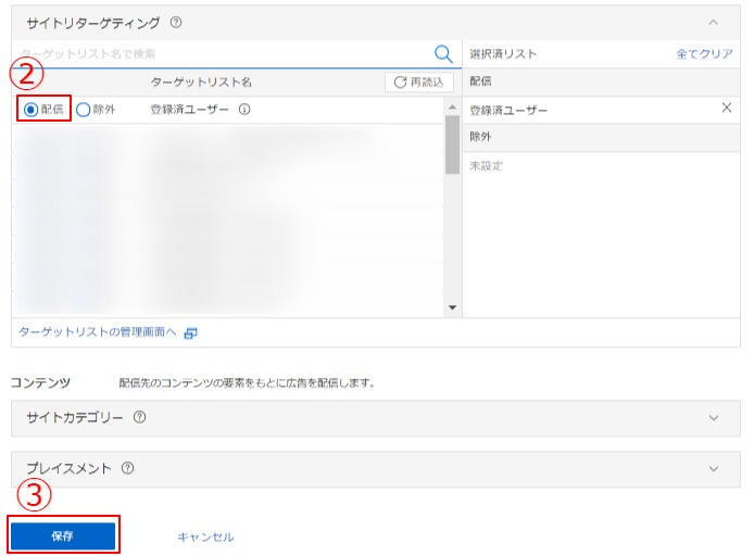②ターゲットとするカスタムリストの「配信」を押す