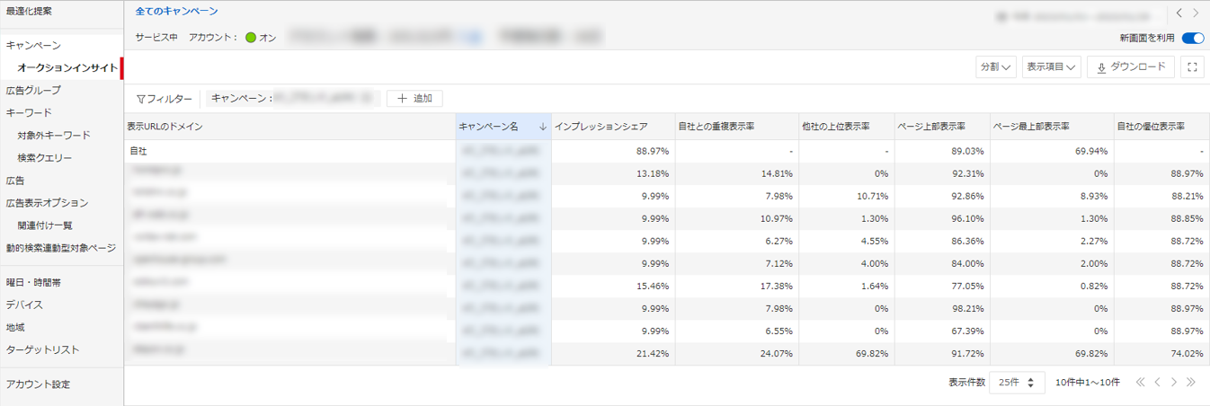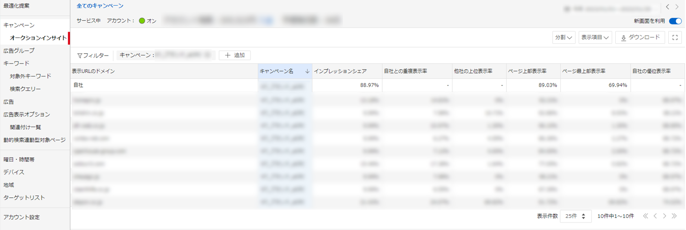 ③最後に「オークションインサイトを表示」をクリックすると下記のように、オークションインサイトの各指標を確認できます。