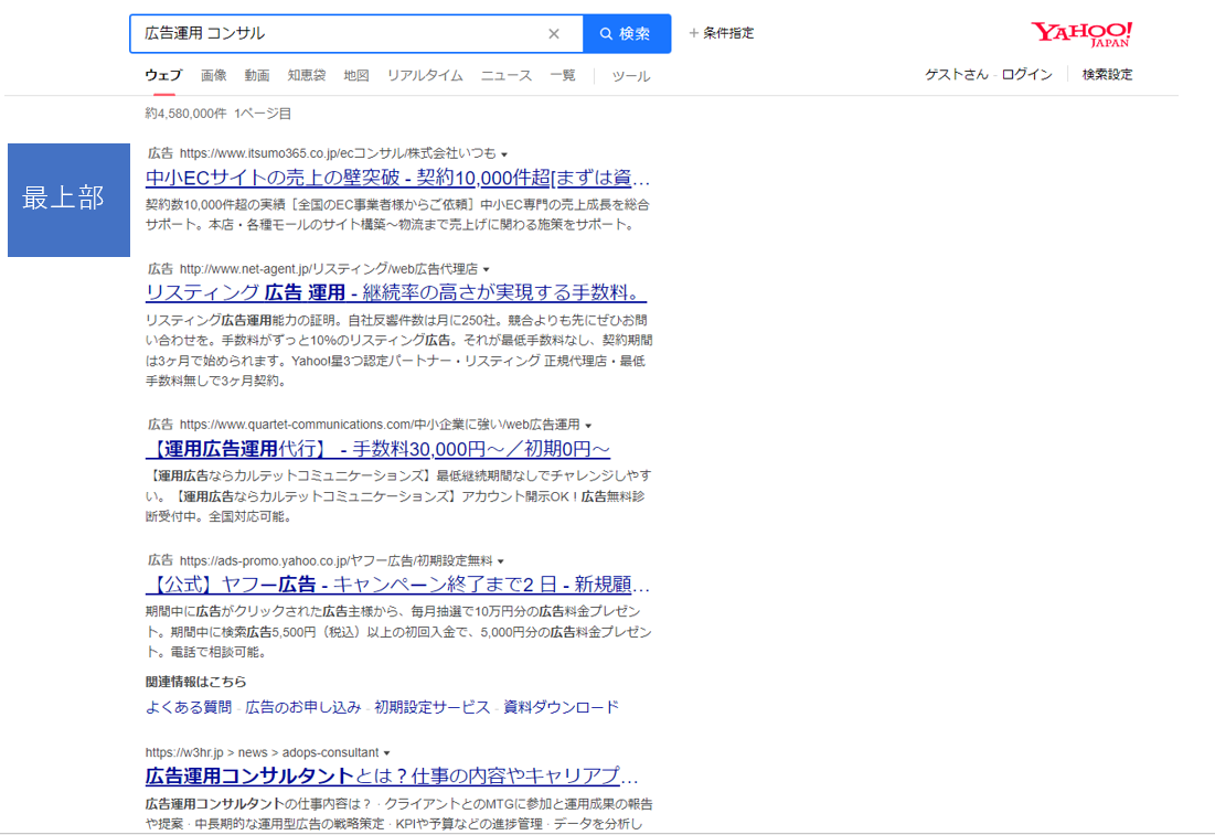 検索結果の上部は検索ユーザーの目に比較的触れやすい場所です。検索結果の上部と下部とでは広告に気がついてもらえる可能性や広告をクリックしてもらえる確率も大きく異なります。