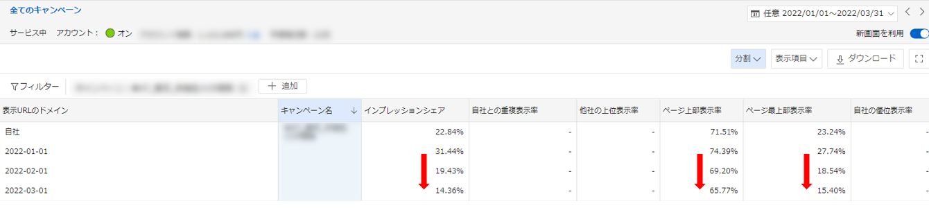画像のオークションインサイトから2022年1月から3月にかけて、「インプレションシェア」「ページ上部表示率」「ページ最上部表示率」の全ての指標が下がっている事がわかります。