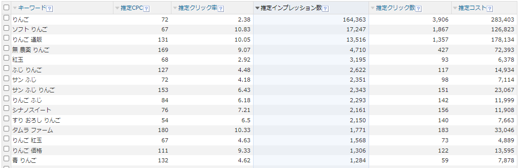 過去にりんご関連のキーワードでの広告配信実績があり推定コンバージョン率がわかる場合は、おおよその見積もりを立てることもできます。