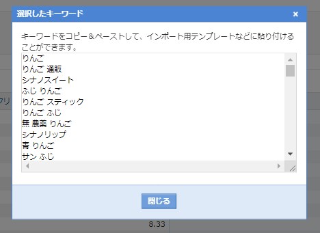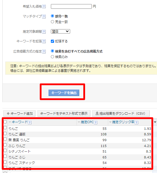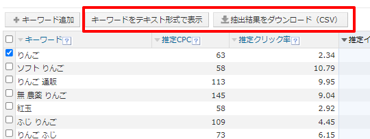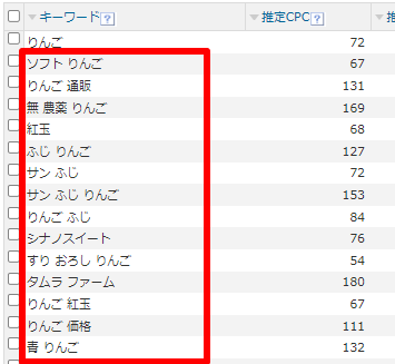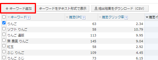 上記は「キーワードまたはフレーズ」に「りんご」と入力し、「キーワードを拡張」で選出したキーワード候補です。