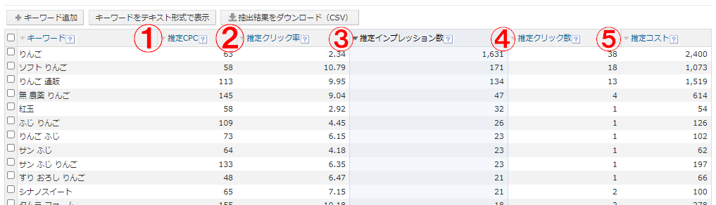 | ①推定CPC | 希望入札価格から算出された推定平均クリック単価 |