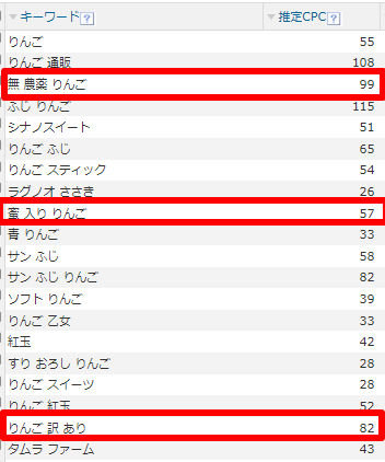 「無農薬りんご」や「蜜入りりんご」「りんご訳あり」など、これらのキーワードを検索する人に「無農薬蜜入りりんご」の広告文を表示できれば、買ってもらえる可能性が高そうですよね。