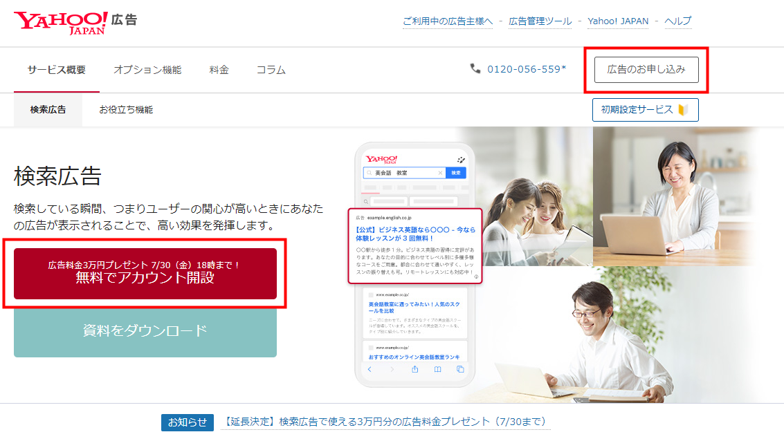 Yahoo!広告 公式サイトにアクセスして「広告のお申し込み」または「無料でアカウント開設」をクリックします。