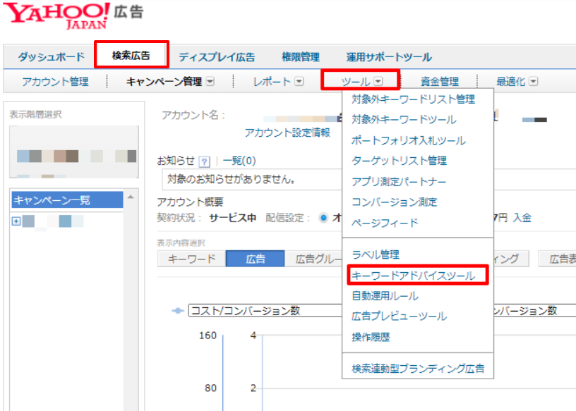 Yahoo!広告のアカウント開設ができましたら、キーワードアドバイスツールにアクセスしていきます。