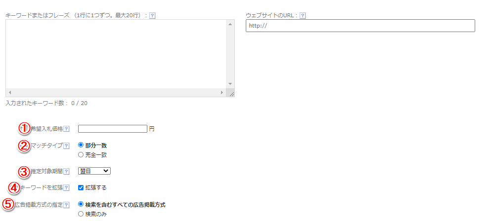 | ⑤推定コスト | 希望入札価格と推定対象期間から出された広告の推定費用 |