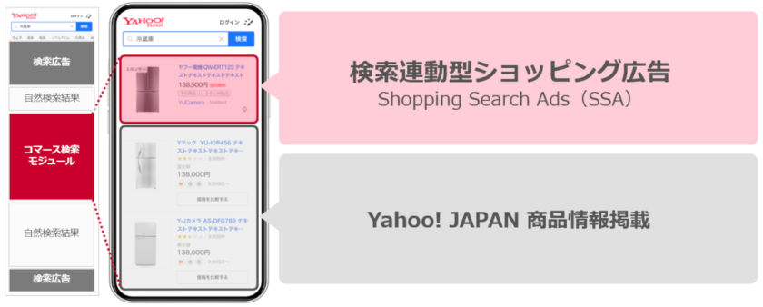 Yahoo!検索連動型ショッピング広告(以下、SSA)は、商品に関連する検索をしたユーザーに対し、Yahoo!の検索結果ページ上部の「コマース検索モジュール」(※)に表示され、商品名、商品画像や価格などの情報を含む視認性の高い広告です。