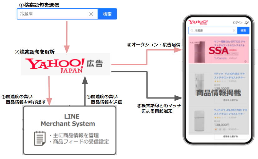また、SSAではキーワードの登録は不要です。「LINE Merchant System(LMS)」を通じてデータフィードとして登録された商品情報をもとに、ユーザーの検索語句との自動マッチングが行われ、該当する商品が広告として表示される仕組みになっています。