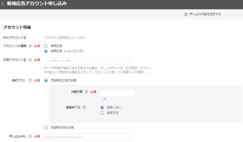 ②新規広告アカウント申し込み画面から、アカウントの種類、アカウント名、契約プラン、月額予算、掲載終了日、申し込みURLの情報を入力します。