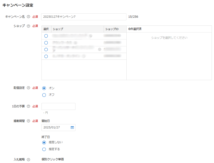 ①キャンペーン作成画面に進み、キャンペーン名・該当のショップ・配信設定・1日の予算・掲載期間・配信する曜日・時間帯・デバイス、除外キーワードなどを設定します。