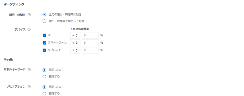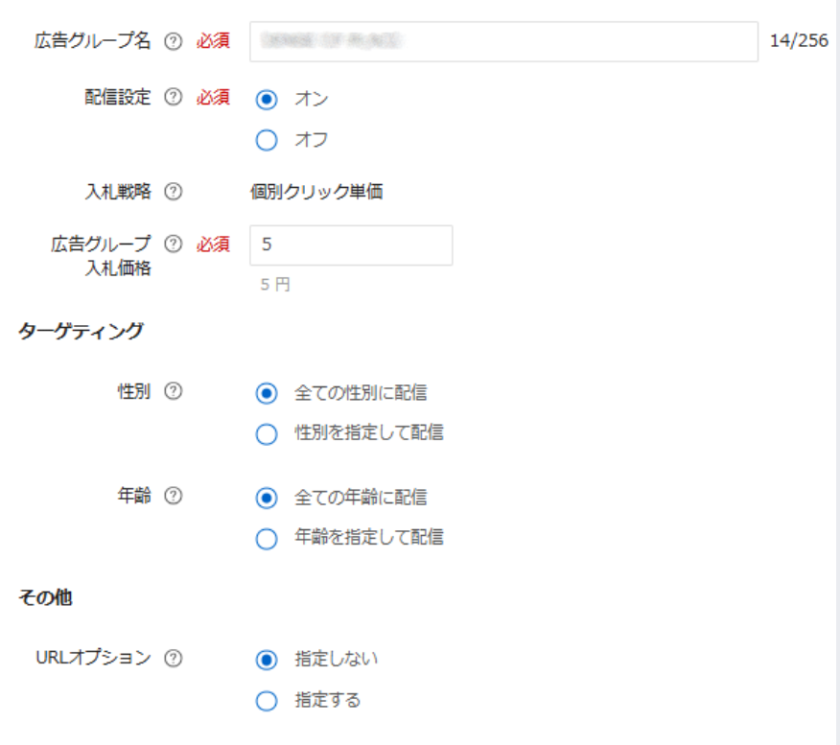 ②続いて広告グループでは、広告グループ名、配信設定、広告グループの入札単価、性別、年齢を設定します。