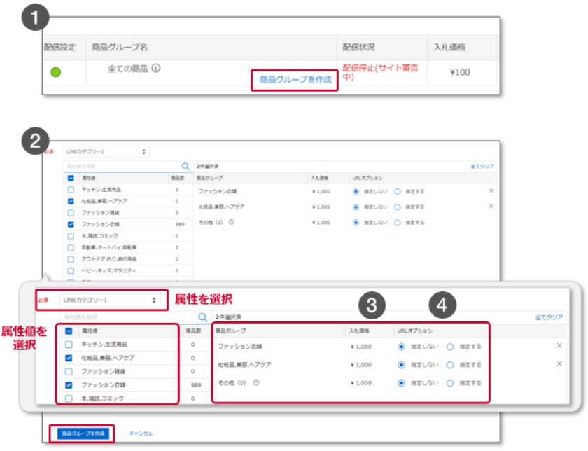 商品フィードで設定したカテゴリ、ブランド、カスタムラベルの項目は、SSA広告管理画面上の商品グループ単位で入札とオーディエンスの設定ができます。