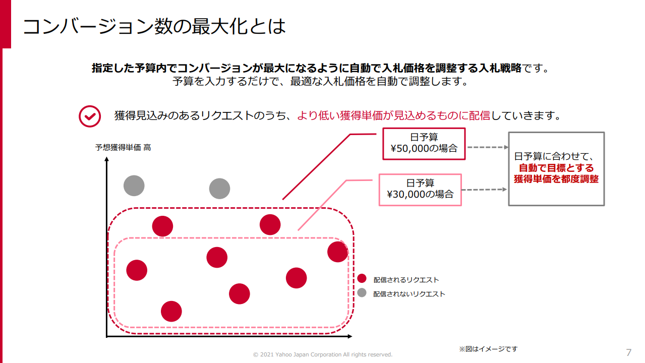 コンバージョン数の最大化とは、指定した予算内でコンバージョン数を最大化するように自動で入札価格を調整する入札戦略です。