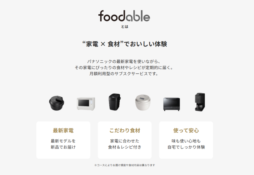 谷一さま:「foodable」は、パナソニックのキッチン家電とこだわり食材を組み合わせて、お客様に「新たな食体験」を届けるサブスクリプションサービスです。月額料金をお支払いいただくと、新品のキッチン家電と、その家電に合った食材が毎月届きます。いつでも解約できる手軽さもポイントですね。
