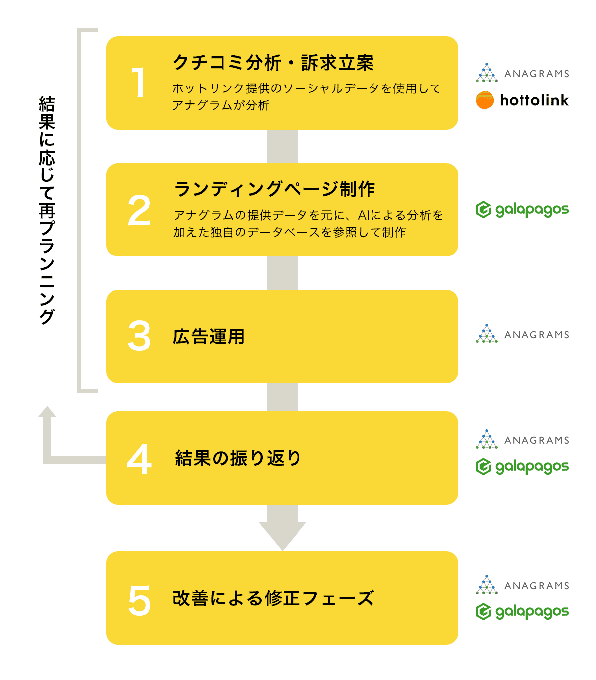 本取り組みでは、ホットリンクが提供するソーシャルデータを、担当商材を深く理解するアナグラムのコンサルタントが分析し、ランディングページの主要な訴求文の立案を担当します。ガラパゴスはアナグラムから共有されたデータを元に、AIによる分析を加えた独自のデータベースを参照してデザインの立案から制作から納品までを行います。完成したランディングページをもとに運用型広告の成果をワンストップで改善していきます。