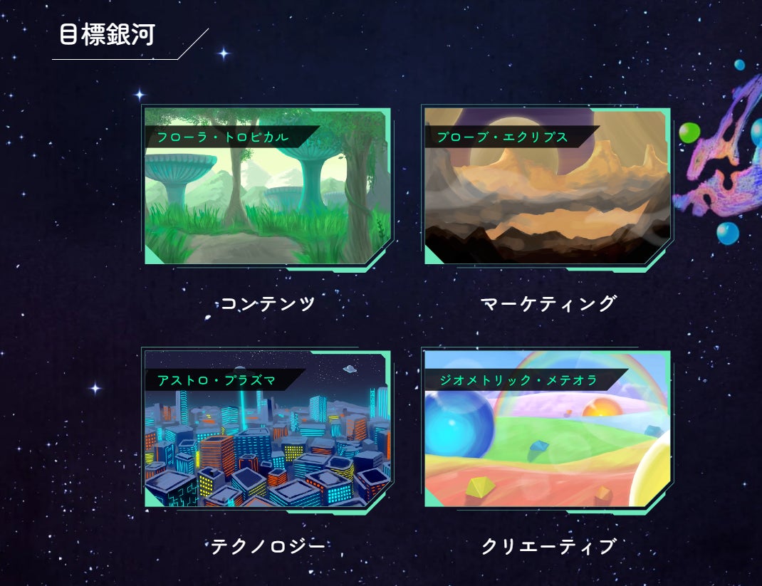 参加者は、宇宙レスキュー隊の隊員として相棒のAIロボットとSOSが届いたいろいろな星へ、宇宙の問題を解決しにいきます。4つの目標銀河に向かい、開拓者(登壇者)のエピソードを通してスキルパーツを獲得し、自分自身とAIロボットの成長を目指します。