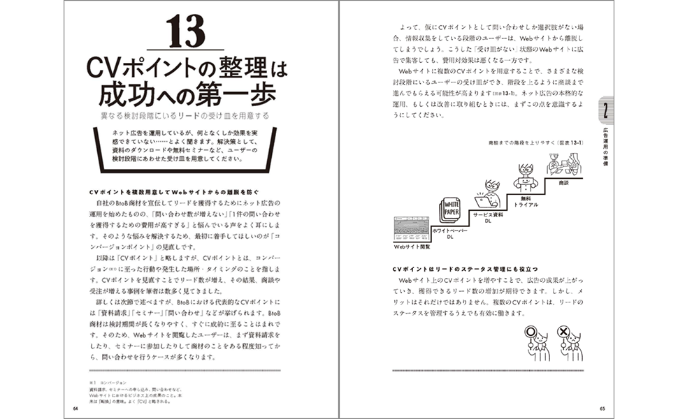 BtoBにおける広告運用では、適切な「コンバージョン(CV)ポイント」を設定することが重要です。代表的なCVポイントには「問い合わせ」「資料請求」「セミナー」「ホワイトペーパー」があり、これらをターゲットとなる顧客の状況や広告媒体によって使い分けていく具体的な方法を提案しています。
