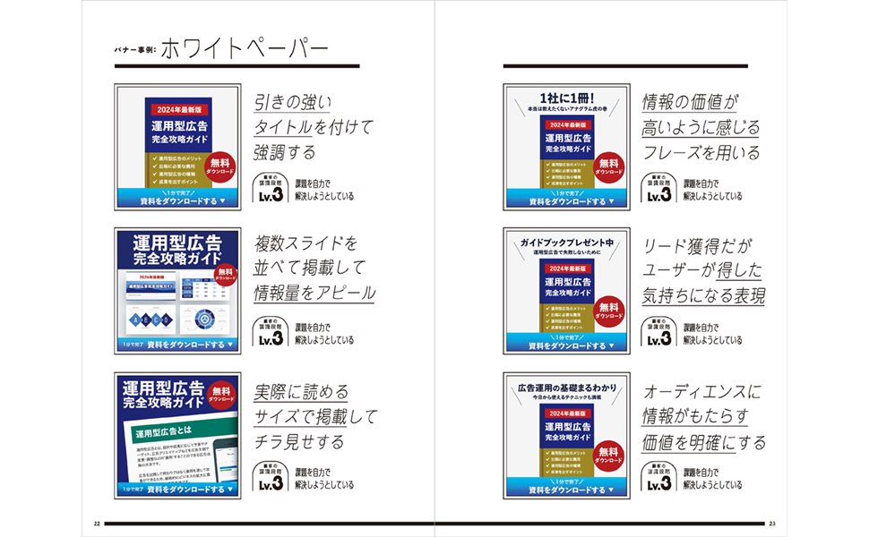 巻頭には代表的なCVポイントごとに、SNS広告を想定したバナーの具体例をカラーで掲載しています。顧客が抱えている課題の認識段階も併記しており、ターゲットの状況によってどのようなキャッチコピーや見せ方が効きやすいのかをイメージしやすくなっています。