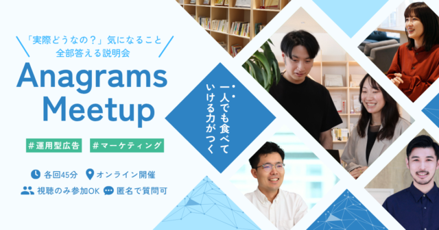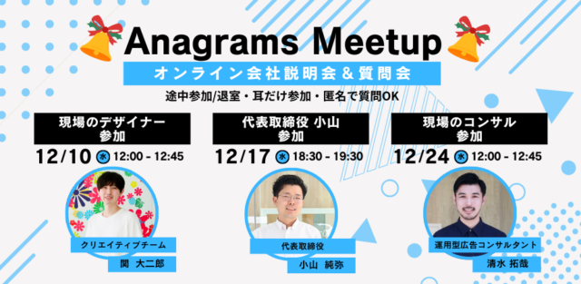 アナグラムで働くことに興味がある!という方も、ちょっとだけ興味があるという方も、よりカジュアルに会社を知っていただくきっかけとして、「オンライン会社説明会-Anagrams Meetup-」を開催しま … 続きを読む Anagrams Meetup(オンライン説明会)...続きを読む